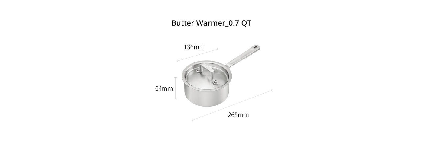 0.7 QT / 13 cm Butter Warmer (0.7 L): 136 mm inner diameter; 64 mm height; and 265 mm total length.