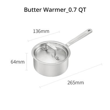 0.7 QT / 13 cm Butter Warmer (0.7 L): 136 mm inner diameter; 64 mm height; and 265 mm total length.