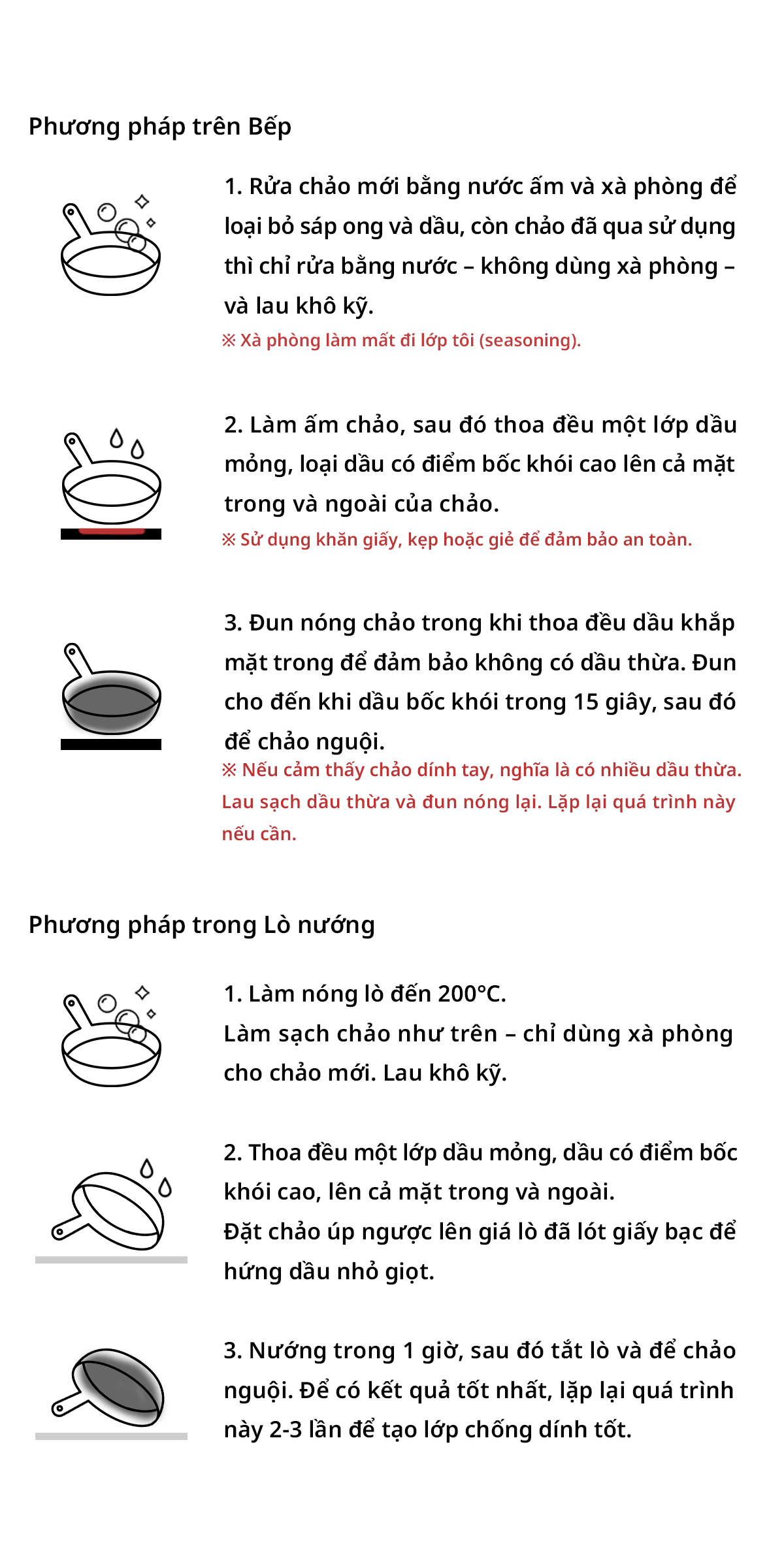 - Tránh nấu các thực phẩm có tính axit như cà chua hoặc kim chi cho đến khi lớp chống dính được hoàn hảo.