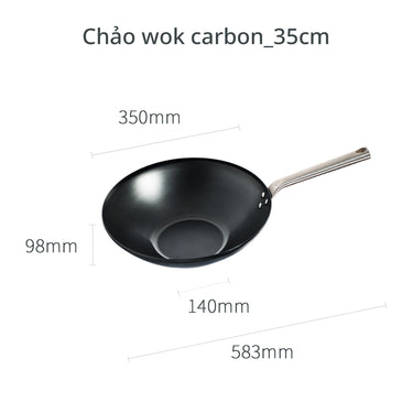 Wok: Đường kính bề mặt nấu 140 mm; Đường kính ngoài 350 mm; Chiều cao 98 mm; và chiều dài tổng thể 583 mm.