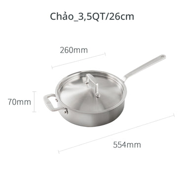 Chảo xào 3.5 QT / 26 cm (3.3 L): Đường kính trong 260 mm; Chiều cao 70 mm; và chiều dài tổng thể 554 mm.