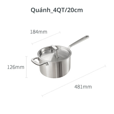 Nồi 4 QT / 20 cm (3.8 L): Đường kính trong 184 mm; Chiều cao 126 mm; và chiều dài tổng thể 481 mm.