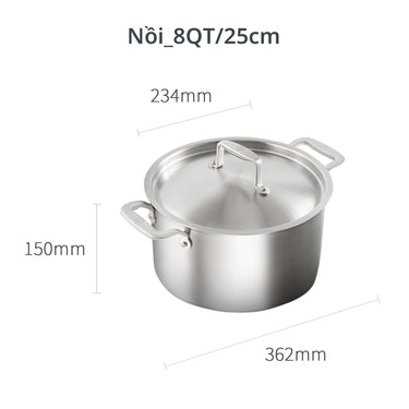 Nồi kho 8 QT / 25 cm (7.5 L): Đường kính trong 234 mm; Chiều cao 150 mm; và chiều dài tổng thể 362 mm.