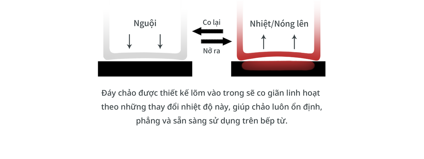 Đáy chảo được thiết kế hơi lõm nhẹ có khả năng chống cong vênh và giữ phẳng — ngay cả ở nhiệt độ cực cao.